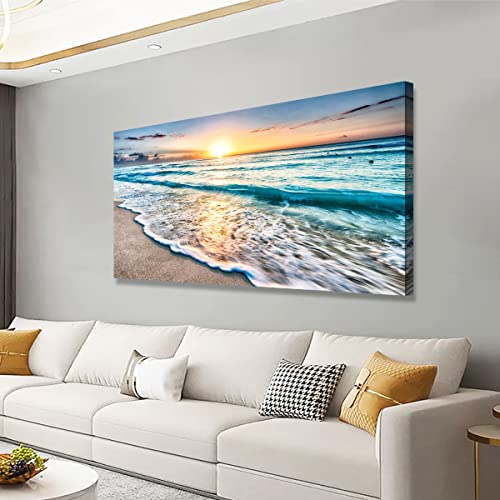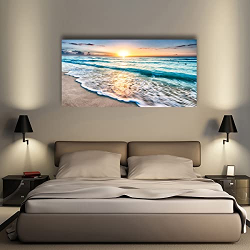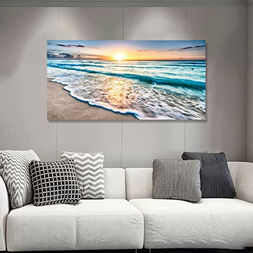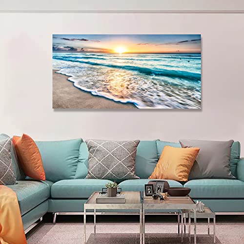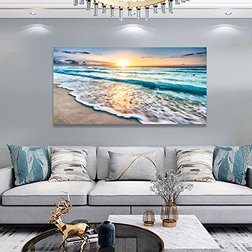 SiGuTie - Beach Wall Art Canvas Prints Seascape Picture Framed House Decor Natural Landscape Poster Blue Ocean with White Waves Sunset Painting Artwork for Living Room Bathroom Kitchen Office Wall Decoration