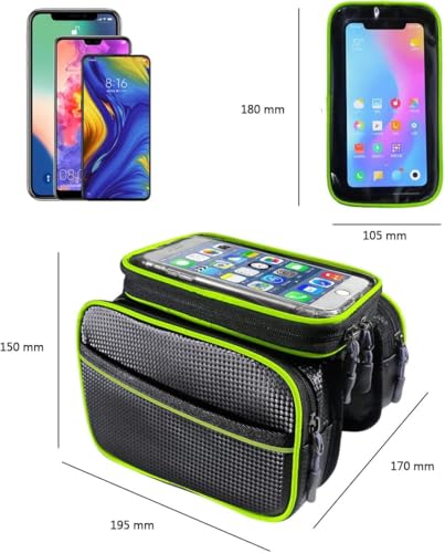 - SENSITIVE TOUCH SCREEN: This front bicycle bag accommodates phones less than 6.5 inches and has a sensitive touch screen window. Interact with your phone while cycling, on-the-go display, time, music and other information. No need to take out your phone and the risk of damaging it.