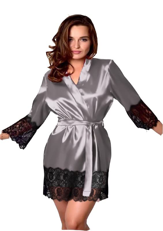 Generic - Black Satin Robe for Women Decorated with Black Fossil