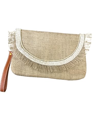 Generic - كلاتش بسوار صغير منسوج من الجوت للنساء باللون البيج حجم مدمج مع حواف دانتيل