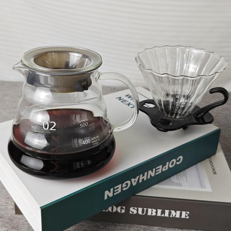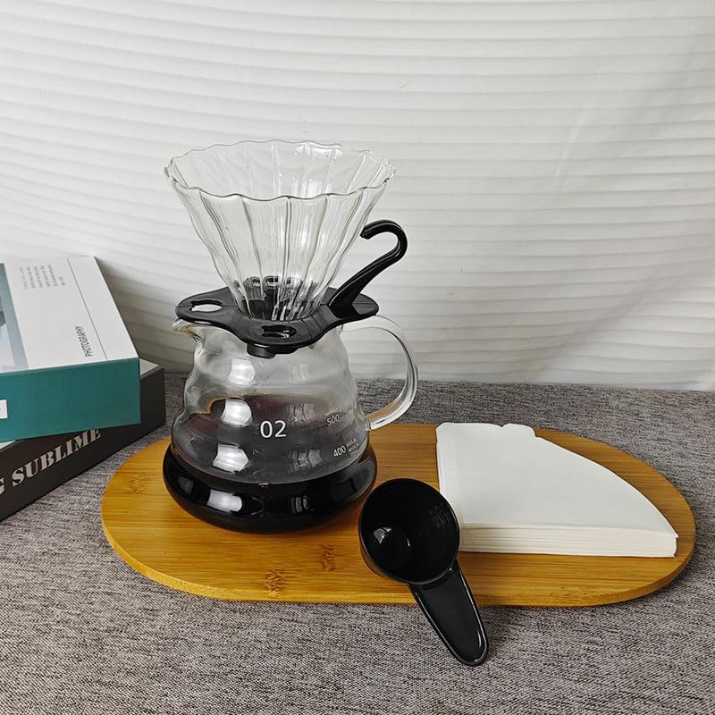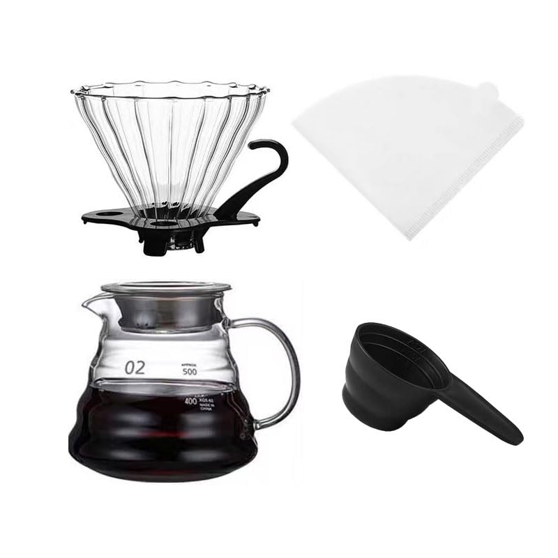 - [Product List]: This pour over coffee set includes 100 filters, a filter cup, a glass lid and a sharing pot. This 4-in-1 set can fulfill your hand brewed coffee needs.