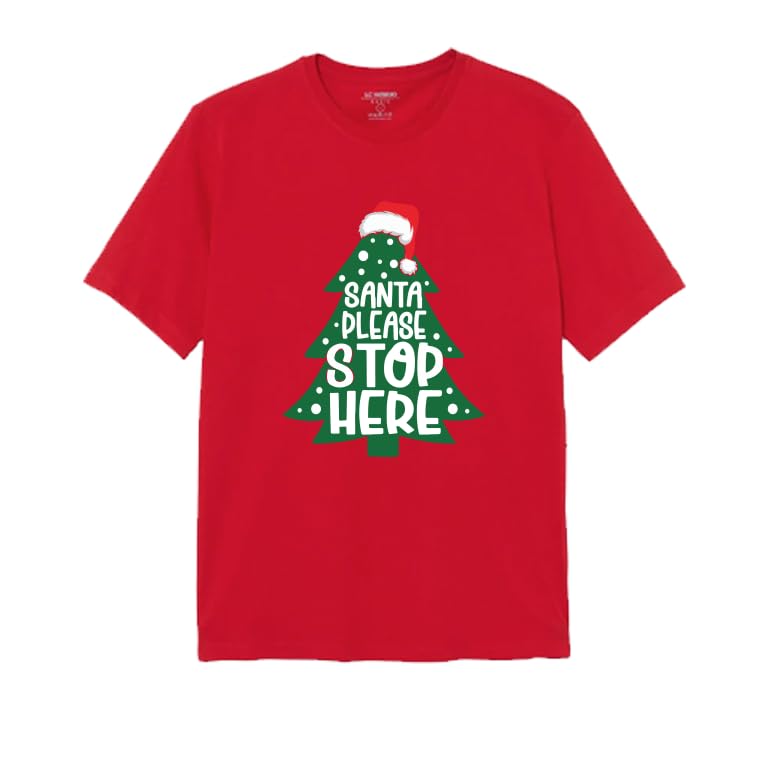 Generic - Christmas T-Shirt with Santa Please Stop Here Design, Red Cotton Holiday Tee, Tree Graphic Print Size (3-6Y)