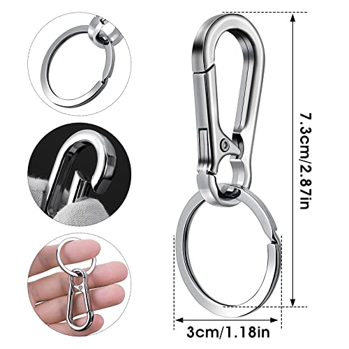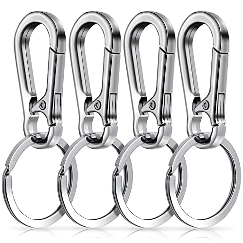 - Carabiner keychain SetYou will Get 4 packs Carabiner clip + Key ring with detachable ring in the package, material: zinc alloy (with anodized surface). Never RustThe rings are plain round steel and very strong. Never rust; even if putting it in the water or saline water.