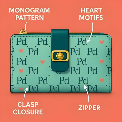 - Elevate your everyday style with this charming patterned wallet that features a distinctive monogram design adorned with delicate heart motifs, making it a fashionable accessory that combines aesthetic appeal with personal charm.