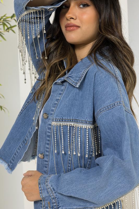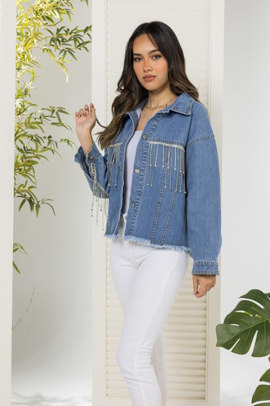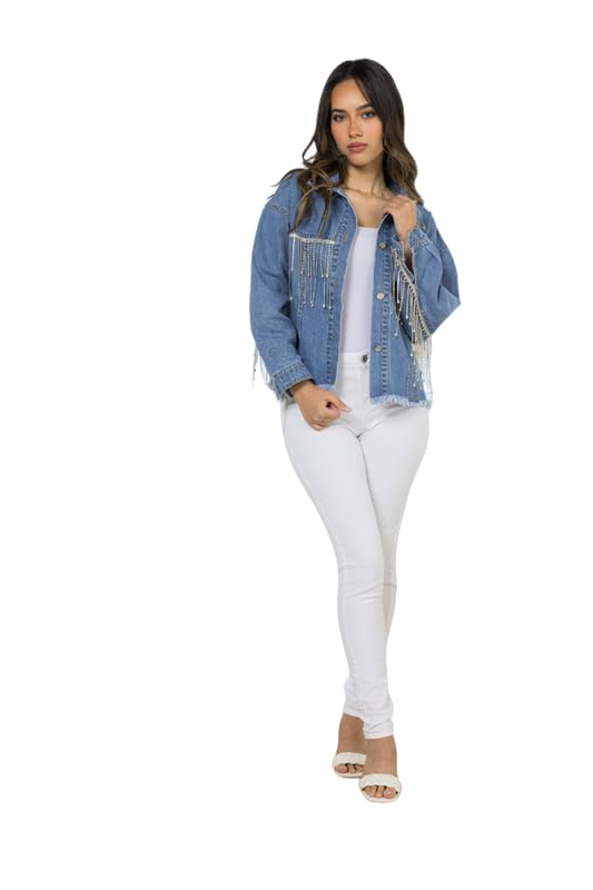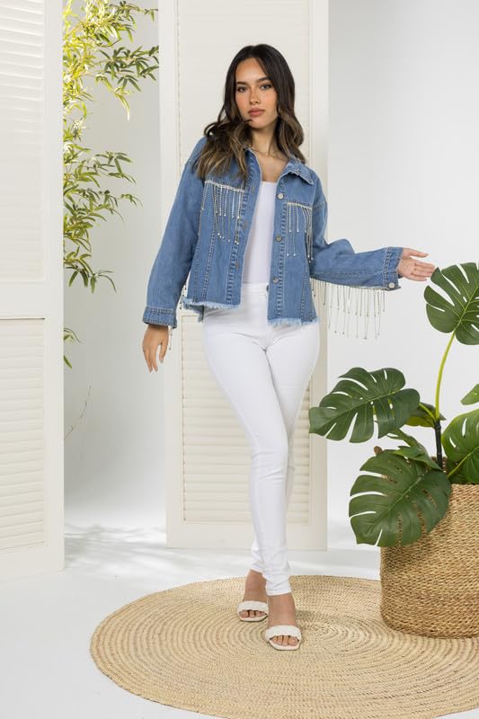 COZY UP IN STYLE - جاكيت جينز كاجوال وأنيق للنساء بأزرار إغلاق مع شراشيب لامعة مرصعة بأحجار الراين خفيف الوزن ومثالي لأزياء الخريف والشتاء من كوزي اب ان ستايل
