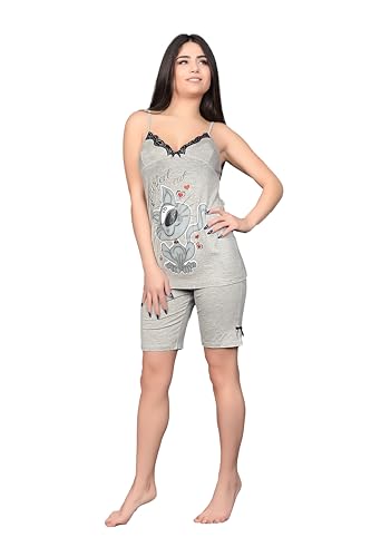 Dadoush - بيجامة هوت شورت قطعتين للنساء من دعدوش - طقم بيجامة شورت بدون اكمام مطبوع وصدر دانتيل مميز