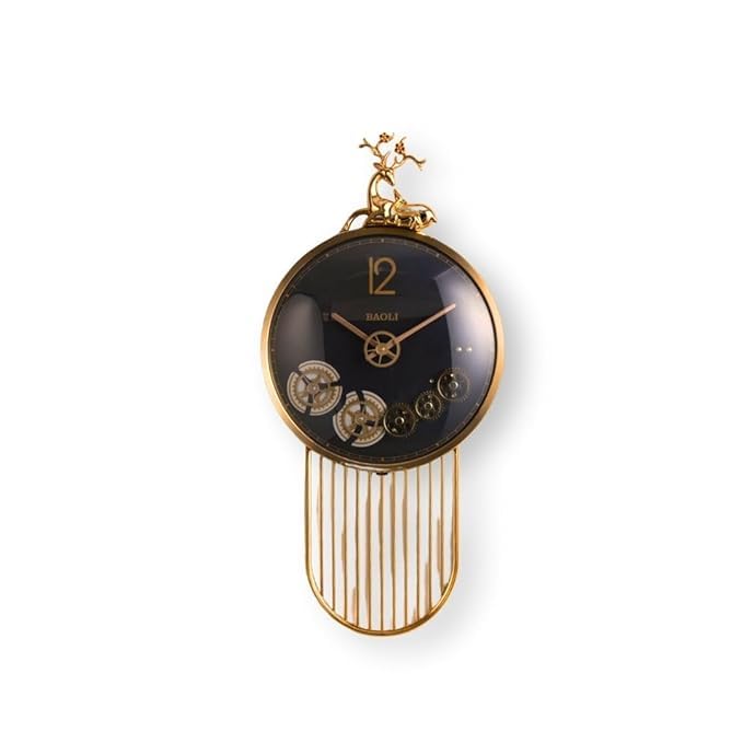 - DESIGN AESTHETICS: Elegant wall clock featuring a luxurious gold-tone frame with decorative deer figurine, black face, and vertical bar pendulum design