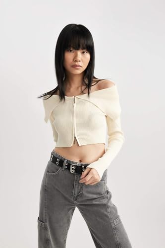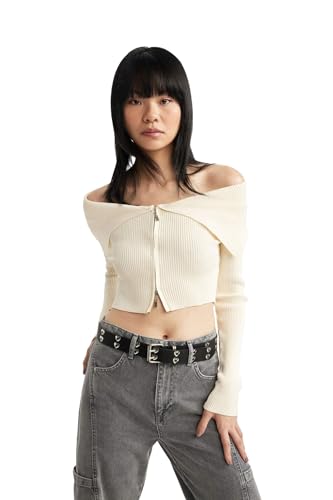 DeFacto - DeFacto Woman Slim Fit Bardot Neck Long Sleeve Tricot Cardigan B3739AX,Beige XS