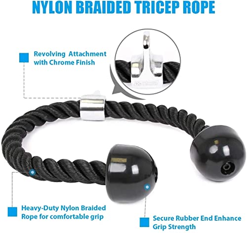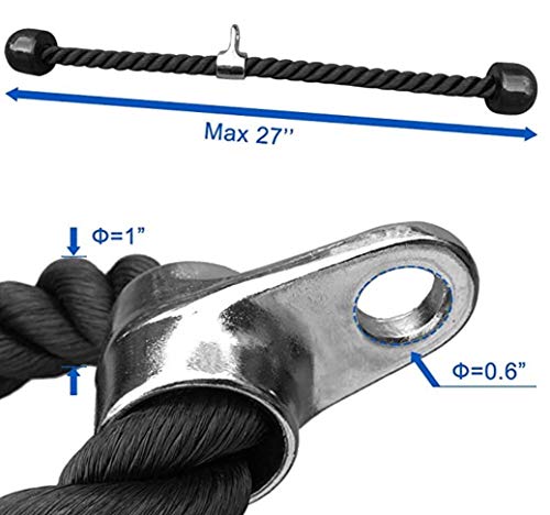 - 27" Tricep Rope: heavy-duty nylon braided tricep rope cable attachment with non-slip rubber ends for comfortable grip. 1-inch diameter of rope and 0.58-inch diameter of hole make easy to combine with the multi-gym equipment system