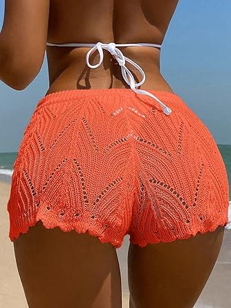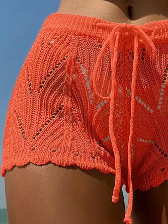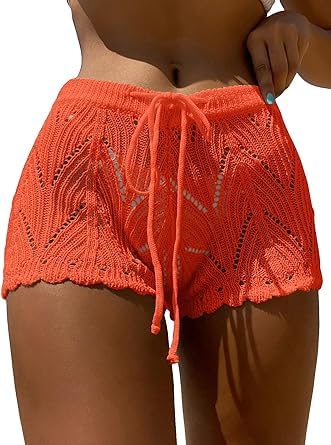 fashion mania - fashion mania Women's Drawstring Beach Sheer Hollow Out Crochet Shorts Swim Cover Up Beachwear