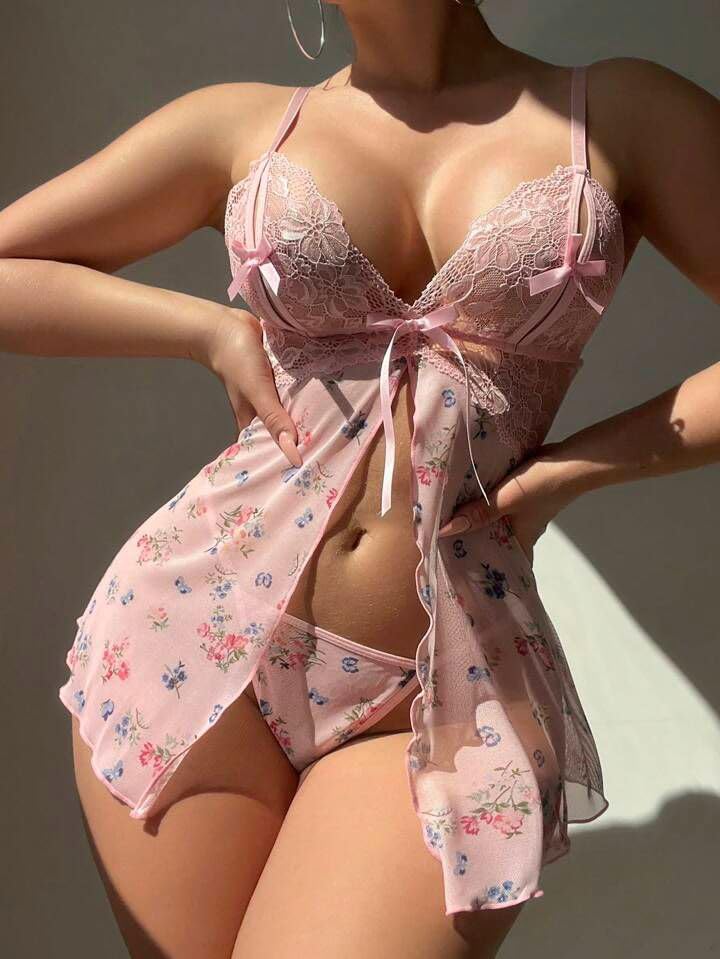 Generic - لانجرى سكسى بنمط فستان مطرز بورود مزين بفيونكات من على الصدرليجعلكى اكثر اناقه لانجرى مثير بيبى دول قصير قميص نوم حريمى انيق من Four H كود 524
