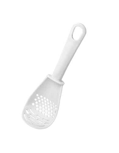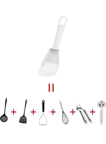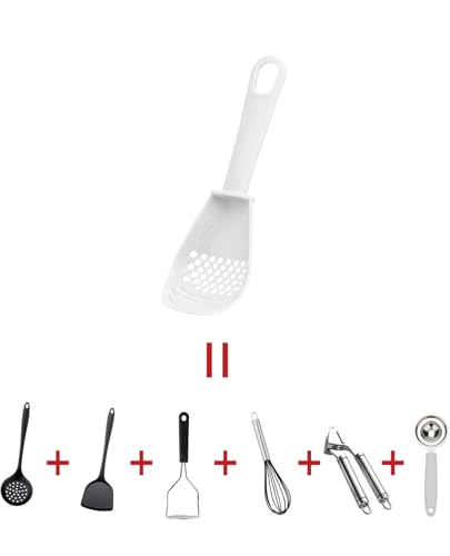 - MULTIFUNCTIONAL DESIGN: 6-in-1 kitchen utensil combining colander, grater, masher, skimmer, scoop, and egg separator functions in one convenient tool