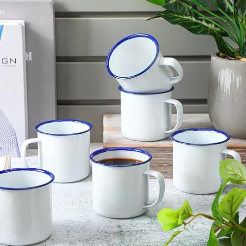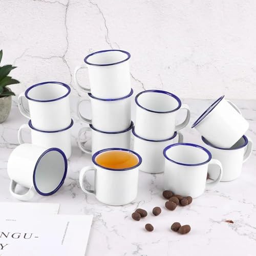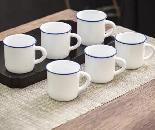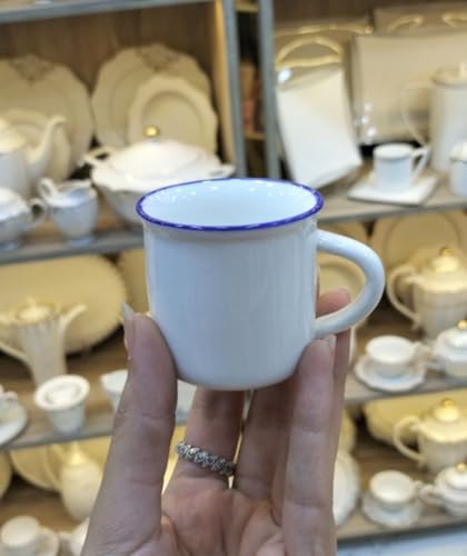 - فنجان قهوة بورسلين أبيض مع حدود زرقاء تضفي مظهرًا فاخرًا وأنيقًا.