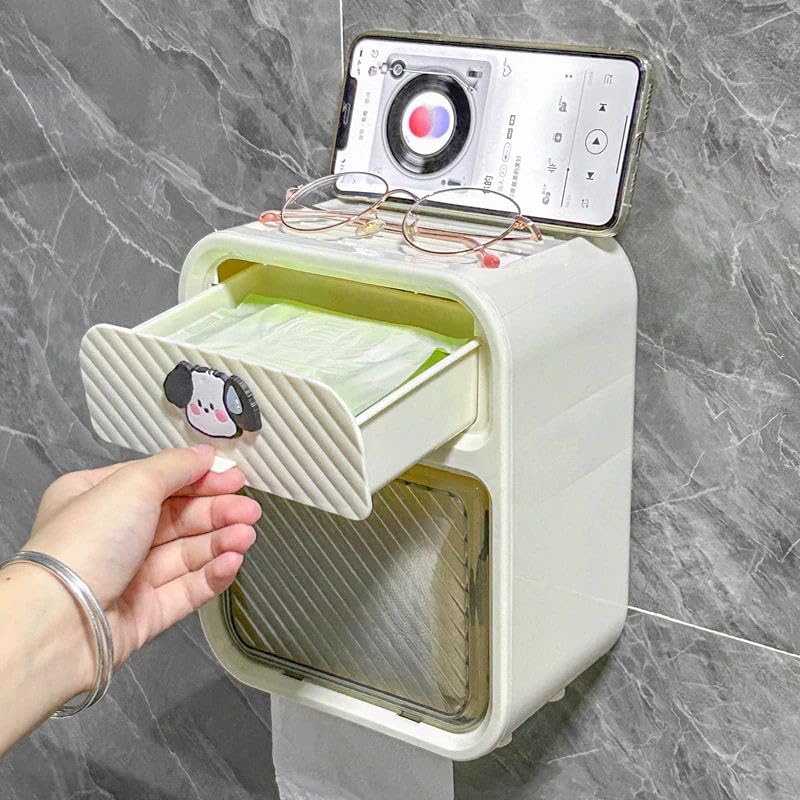 - MULTI-FUNCTIONAL DESIGN: Wall-mounted tissue box holder featuring a convenient phone stand on top and a practical storage drawer for small essentials