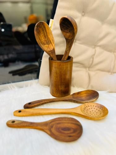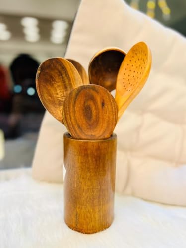 - COMPLETE SET: 5-piece wooden kitchen utensil collection including 4 uniquely designed cooking spoons and a cylindrical storage holder