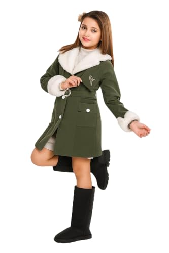 Generic - معطف شتوي للبنات مع حواف من الفرو الصناعي، جاكيت طويل بحزام وجيوب، أخضر زيتوني
