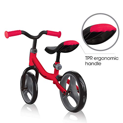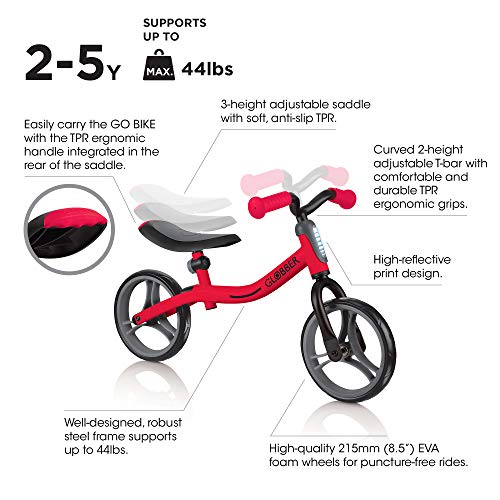- Go Bike - Red is a balance bike designed to help young children develop coordination and confidence. Bright red frame adds a sporty and fun appearance. Perfect for early riders transitioning to pedal bikes.