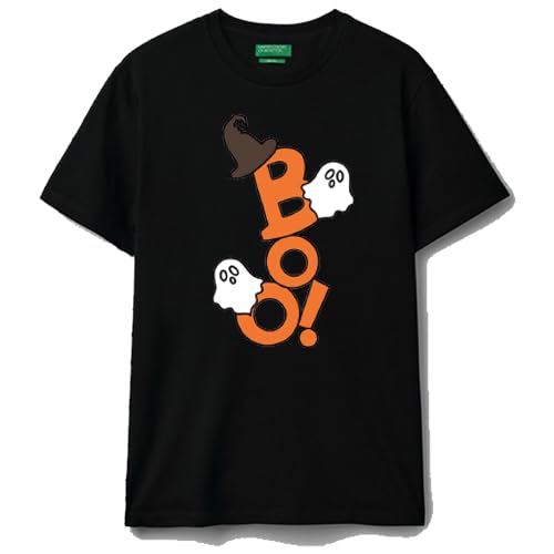 Generic - Halloween Ghost T-Shirt, Black Cotton with Orange and White Print, Spooky Graphic Design Size (M)