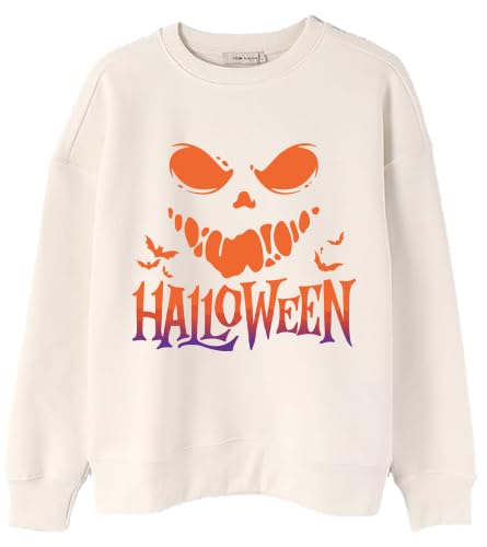 Generic - Halloween Graphic Print Beige Sweatshirt Cotton Blend Pullover, Spooky Face Design, Casual Long Sleeve Size (L)