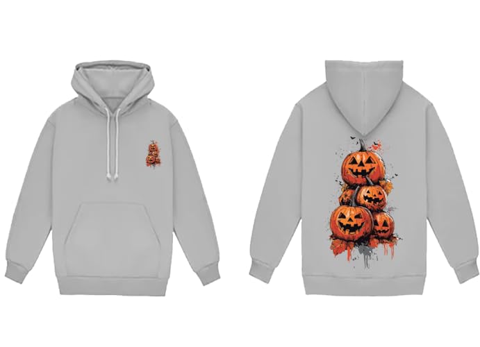 Generic - بلوفر بغطاء للرأس بتصميم يقطين للهالوين بجيب أمامي وطبعة جرافيك، لون رمادي، مقاس لارج L