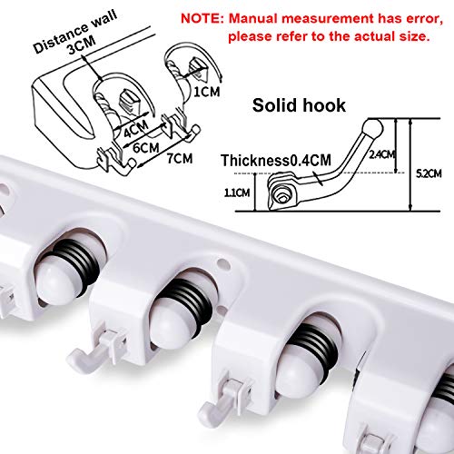 - NO-SLIDE Design Broom Organizer- 5 spring-loaded slots with rubber grips that hold tightly to tool handles to keep them firmly in place. 6 Heavy Duty hooks are movable.