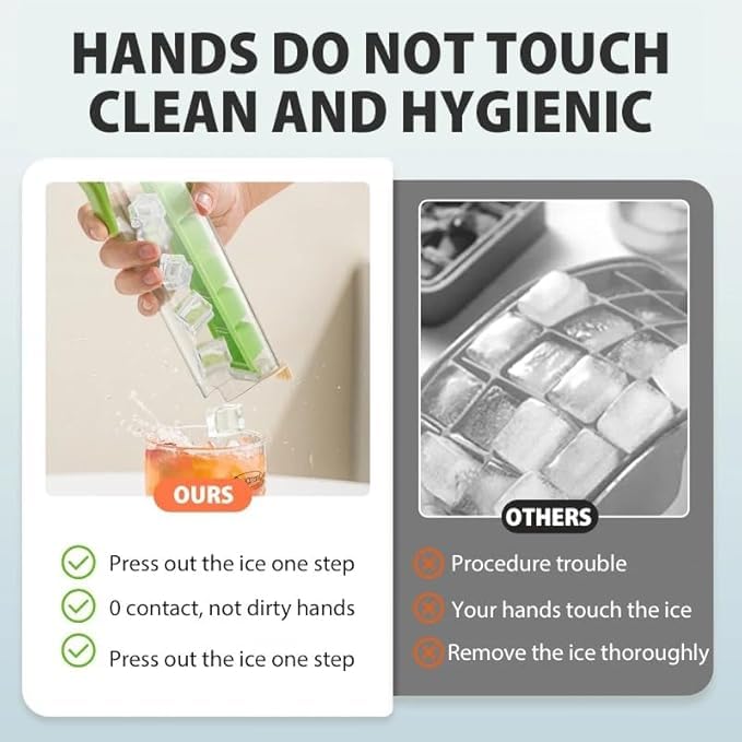 - آلية الضغط بيد واحدة: يمكنك فك مكعبات الثلج بسهولة بضغطة واحدة، بدون الحاجة للّف أو الطرق على القالب.