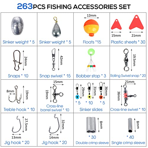 - 💦 263Pcs Fishing Tackles Set in the Box Contains All Kinds of Fishing Accessories You Need for Different Fishing Occasions.