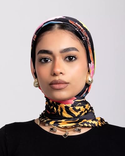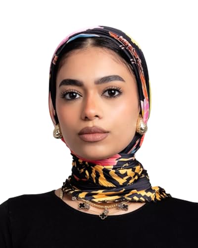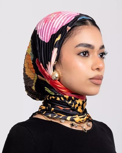 JAMILA جميلة - Luxury Pleated Hijab Scarf, Multicolor Floral Print with Black Base, Premium Fabric with Gold Chain Detail, Modern Fashion Headscarf