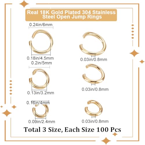 JAZZEEL - JAZZEEL 300Pcs 18K Gold Plated Open Jump Rings Box Set, 4/5/6mm Single Loop Connectors, Small Circle Links for Bracelet, Necklace, & Keychain Jewelry Making for DIY Fine Jewelry Crafters