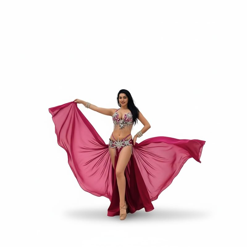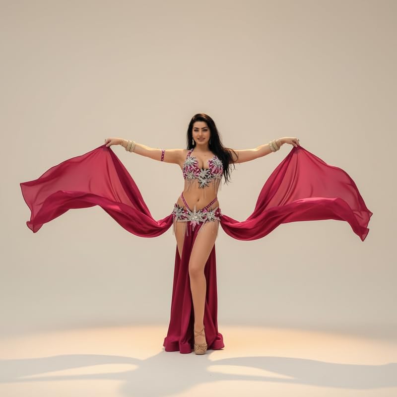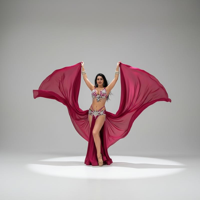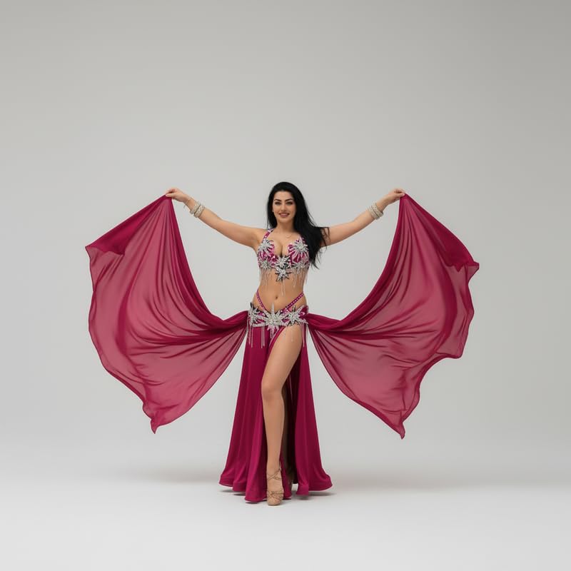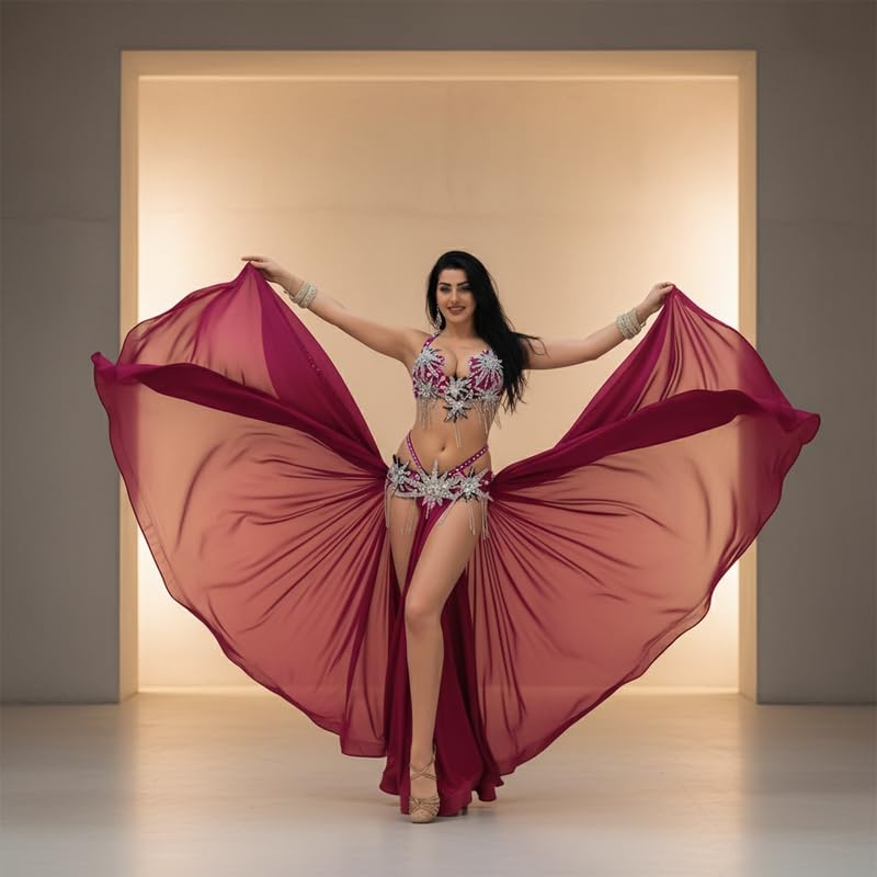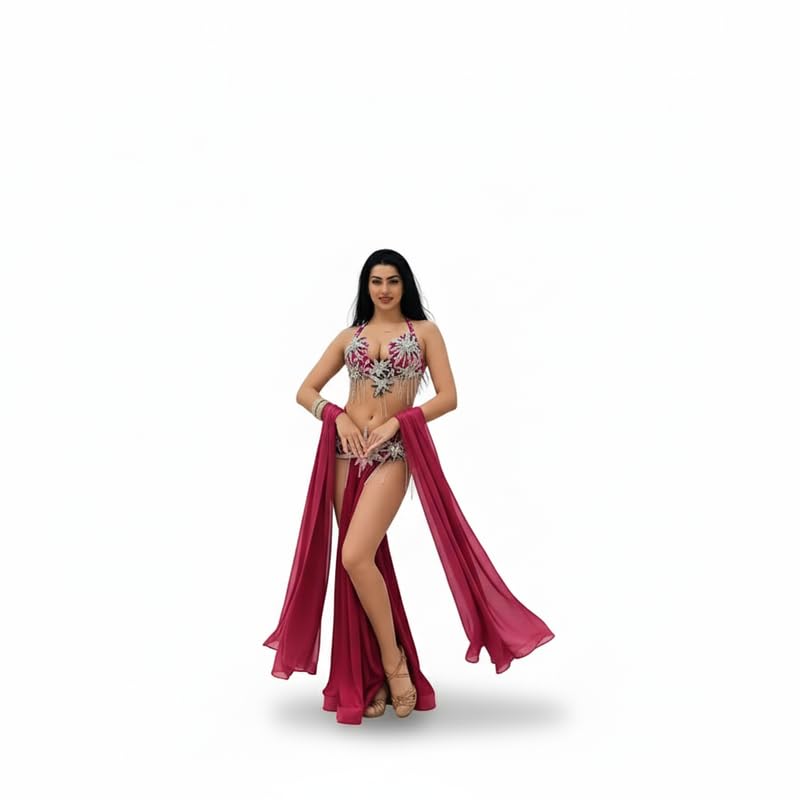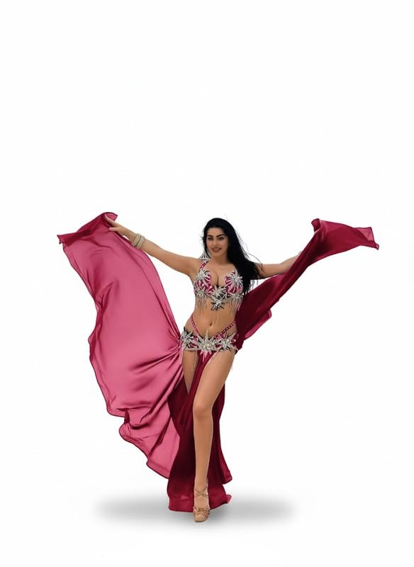 JAZZEEL - أزياء رقص شرقي احترافية تتضمن حمالة صدر وحزام كريستال مطرز يدويًا مع تنورة من الساتان بفتحة من جازيل، طقم من 2 قطعة ملابس للعروض المسرحية والرقص الشرقي الاحترافي