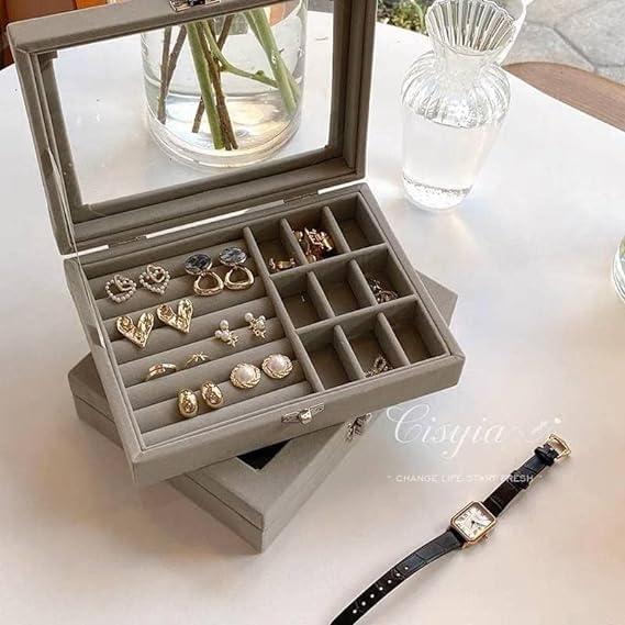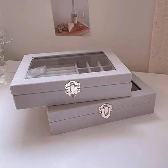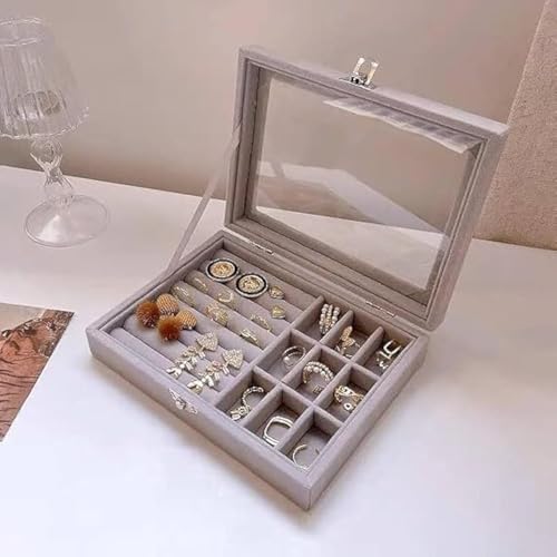 Al Arab for Import & Distribution - Ismail EL Fiky - صندوق مجوهرات وشنطة اكسسوارات للسفر، منظم للسلاسل والحلقان والخواتم هدية لطيفة للبنات - لون رمادي، -قطعة واحدة -20*15*5 سم، الخشب