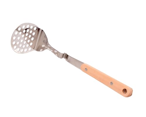 - DURABLE CONSTRUCTION: Professional-grade stainless steel perforated spoon with sturdy wooden handle, perfect for kitchen use