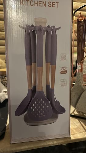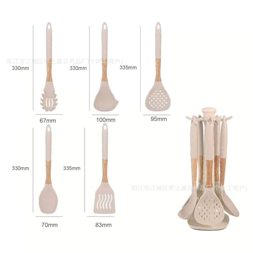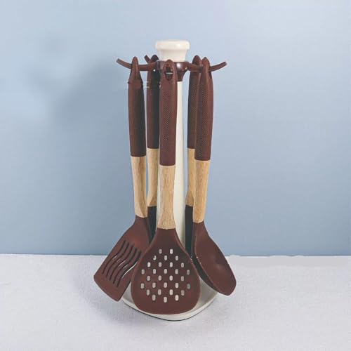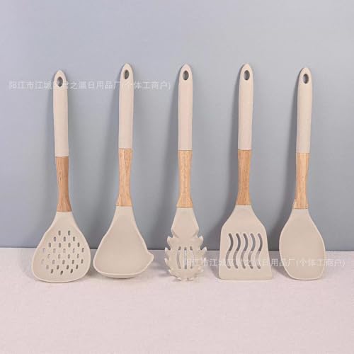 Happy Square - طقم أدوات مطبخ غير لاصقة بمقبض خشبي، أدوات مطبخ من السيليكون للطعام، طقم أواني طهي مكون من 6 قطع، ملعقة سيليكون ومصفاة (شكل 1)