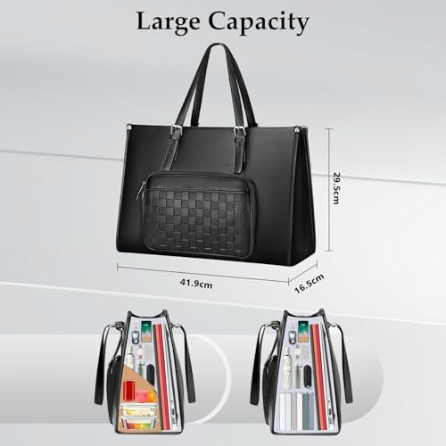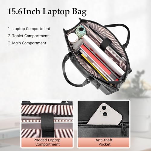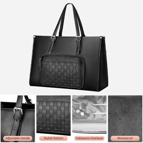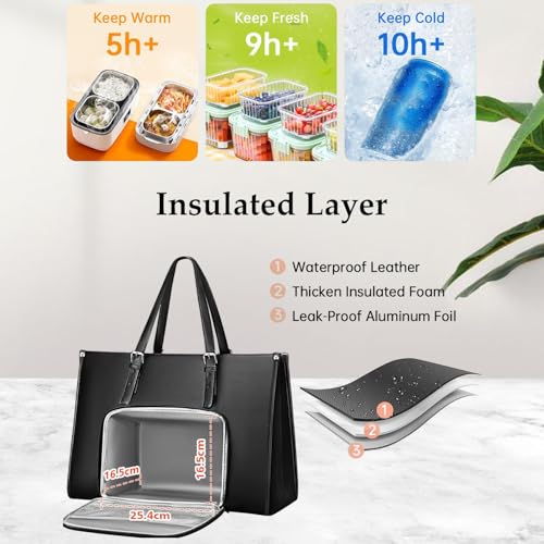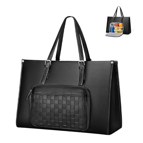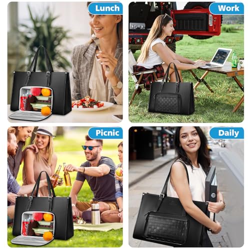 Exrp - Laptop Tote Bag with Insulated Lunch Compartment, 15.6 Inch PU Leather Briefcase with Leakproof Lunch Box Pocket for Women, Convertible Lightweight Computer Work Bag Handbag for Office, Black