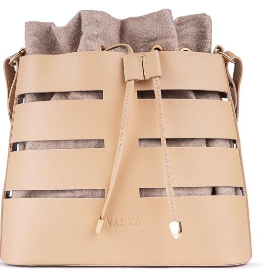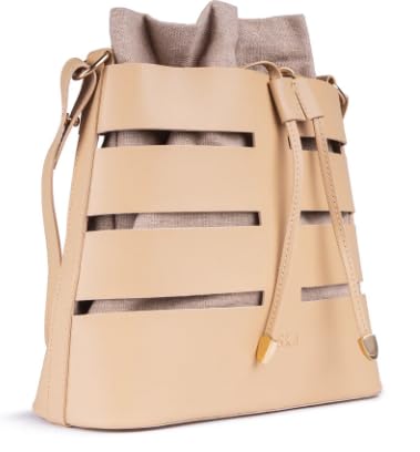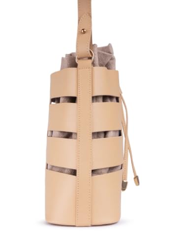 Generic - Leather Bucket Bag, Beige with Canvas Interior, Drawstring Closure, Cutout Design