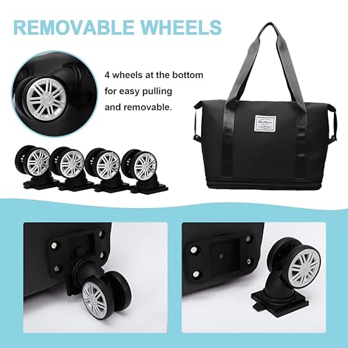 - Equipped with four removable and rotatable wheels, this rolling duffle enables smooth navigation over uneven surfaces; the wheels can be easily installed or removed, providing versatility whether you prefer a wheeled or a shoulder bag.