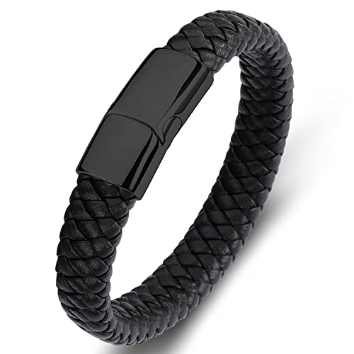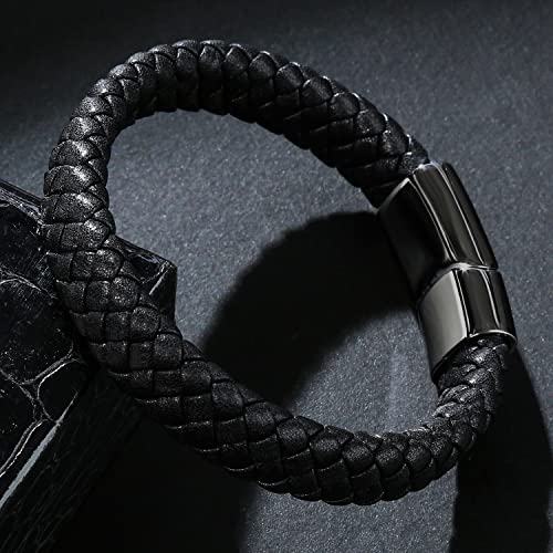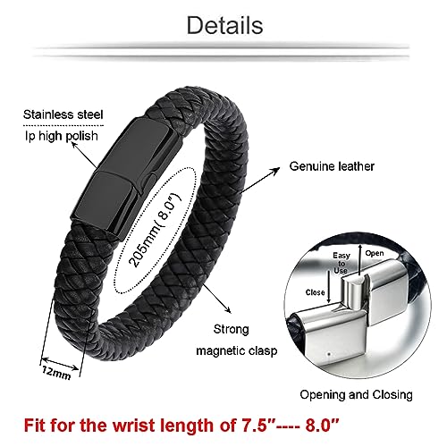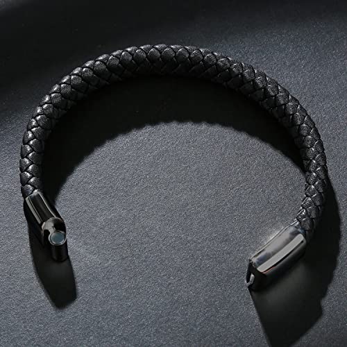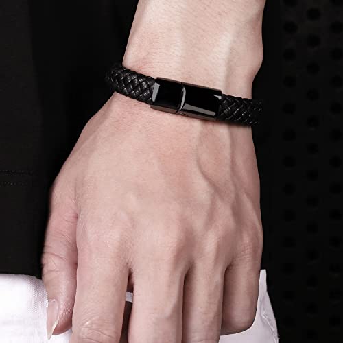 LJWVX - Mens Black Leather Bracelets,Braided Leather Wristband Cuff,Stainless Steel Clasp,Gift for Dad Son