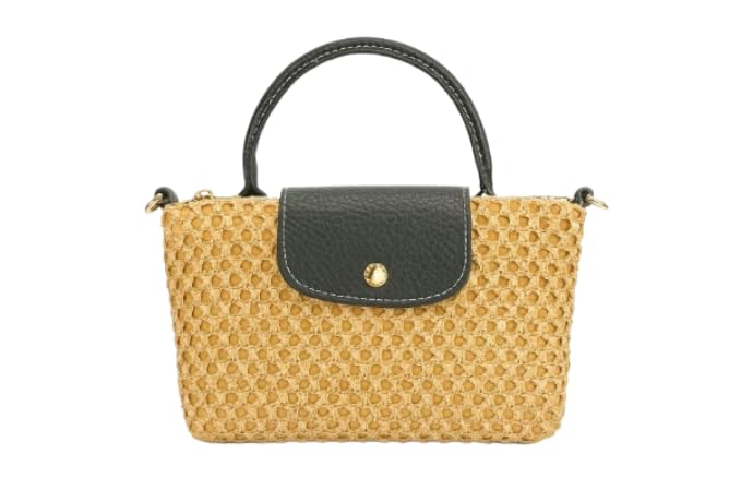 LOU - LOU Woven Straw Crossbody Handbag, Black Leather Flap, Gold Hardware, Natural