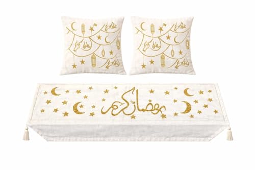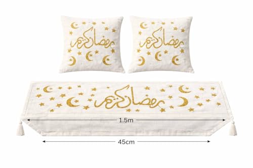 Next store - Luxury Ramadan Runner and 2 Cushion Set Linen Fabric Embroidered "Serma" Gold (Serma Gold) by Next Store Table Runner (1.5m x 45cm) and Pillow Covers (45x45cm) Decorative
