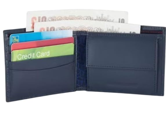 - Tommy Hilfiger Men's Black and Blue Leather Wallet Enhance your accessory collection with the Tommy Hilfiger Men's Black and Blue Leather Wallet. This wallet combines a sleek design with practical functionality, making it an ideal choice for the modern man.