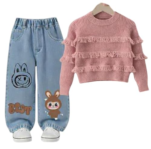 Meza - MEZA Girls Winter 2 Piece Set Ruffle Knitted Blouse with Graphic Jeans Pants Turkish Dough Material