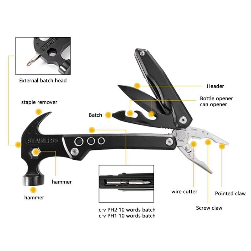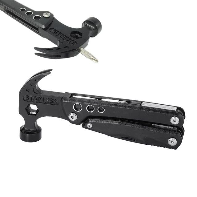- تصميم متعدد الوظائف: تتميز برأس مطرقة متعدد الاستخدامات جنبًا إلى جنب مع أدوات مدمجة متعددة في عامل شكل مدمج وقابل للطي.