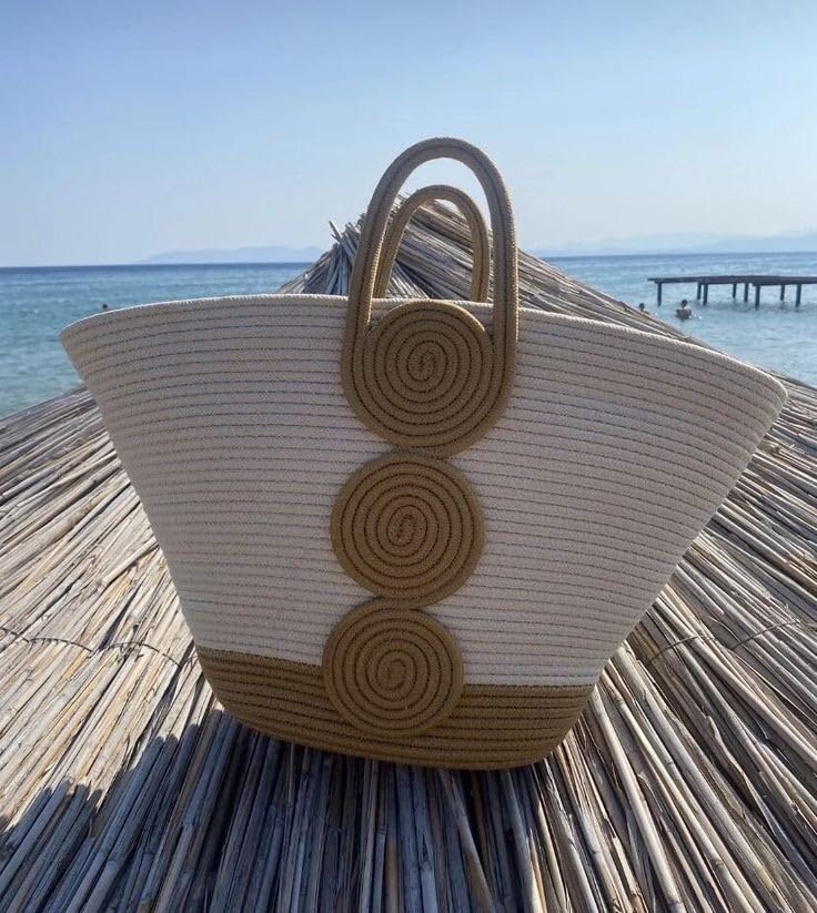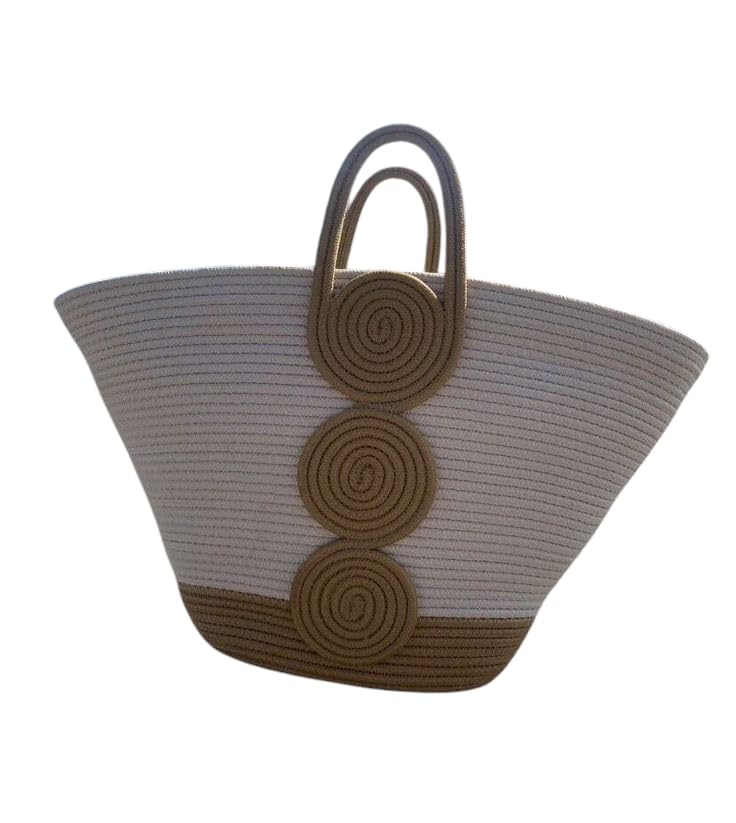 Generic - MZ Large Cotton Rope Beach Tote Bag, White and Brown, Spiral Design, Double Handle