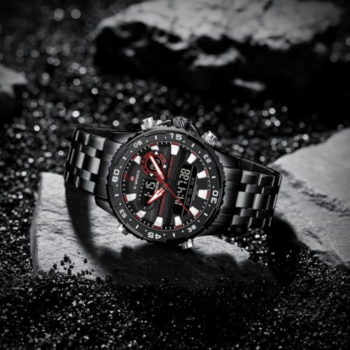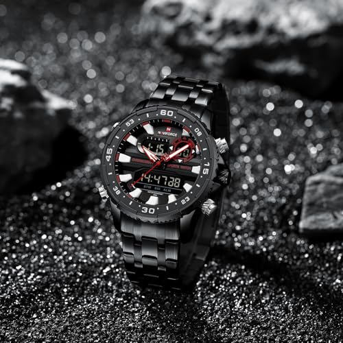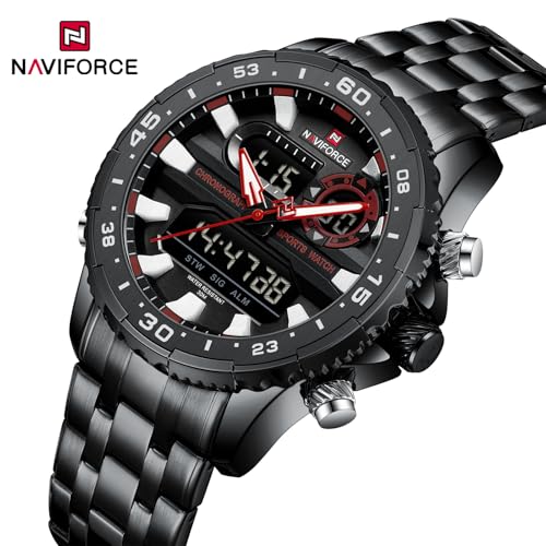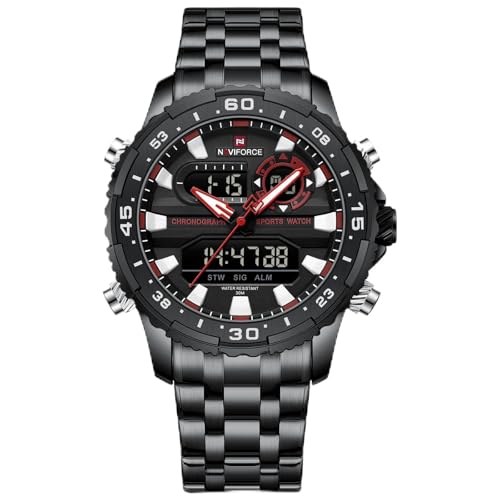 Naviforce - Naviforce Analog Quartz Sport Edition Watch For Mens- Gold Case, Black Dial, Gold Steel Band, Chronograph, Water Resistant 50M Black-Red
