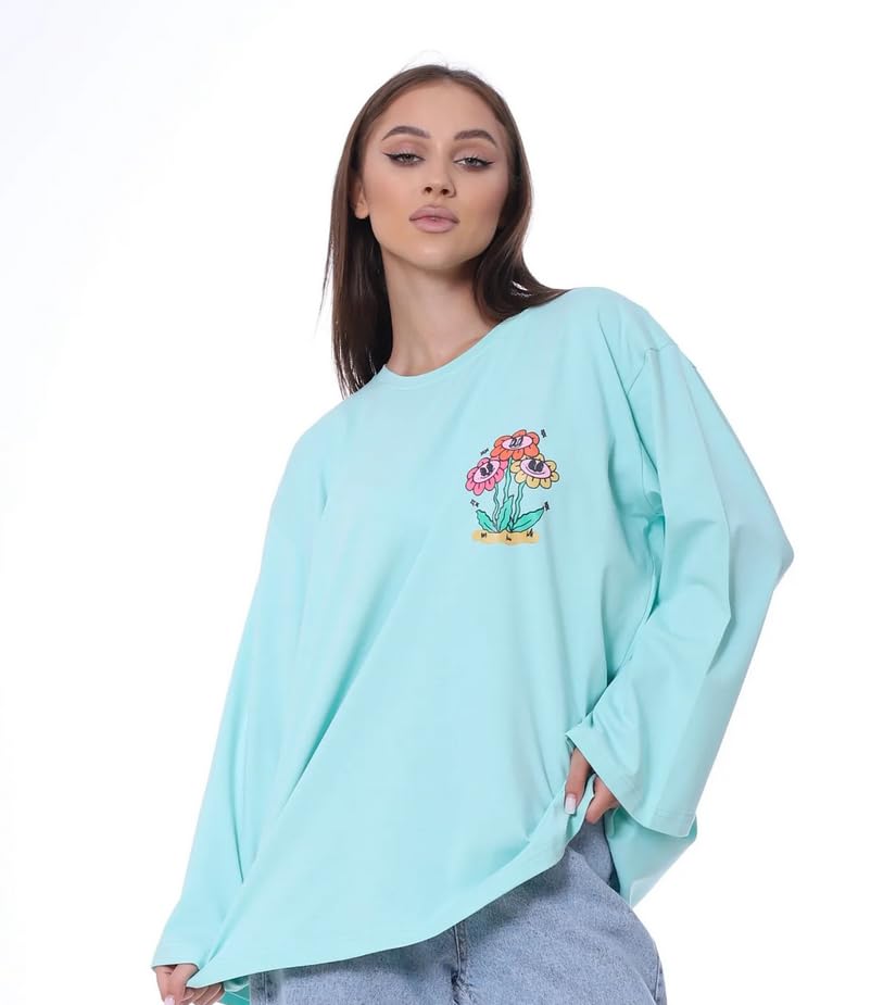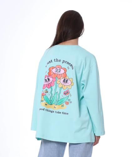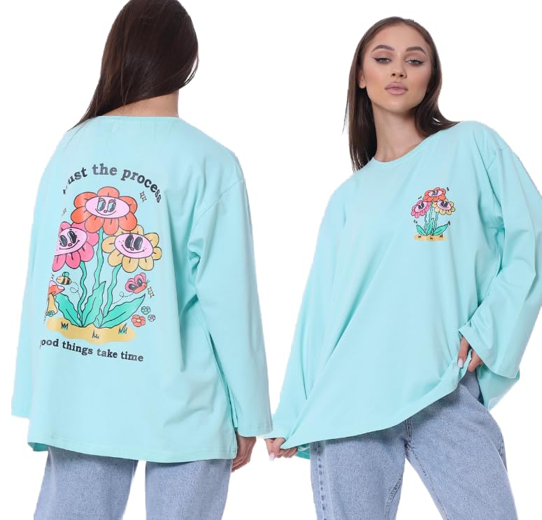 Mamilly Jeans - Oversized Graphic Long Sleeve T-Shirt Trust The Process Design, Floral Print
