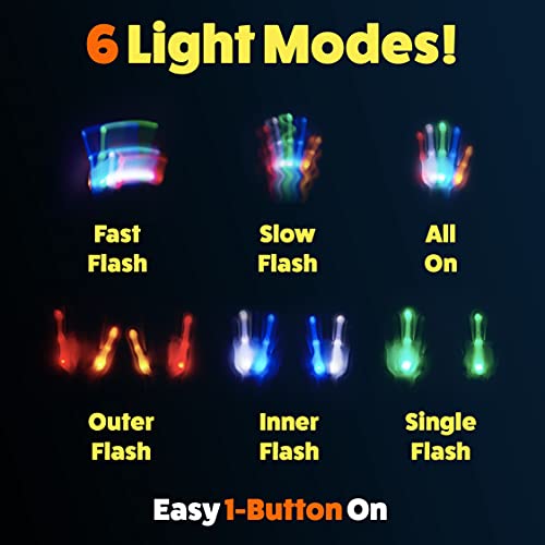 - FINGER LED LIGHT UP GLOVES: Stand out at any party with these wearable glow in the dark LED finger light gloves! Light up skeleton fingers in ultra bright orange, blue, green, white, red LEDs and 6 different flashing glove modes. Perfect LED gloves for kids!