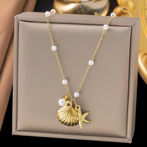 Generic - Pearl Pendant - Seashell Starfish Charm Necklace, Gold Plated, Adjustable Length, Layered Design, Women's Fashion Jewelry, Subtle Ocean-Inspired Style for Summer