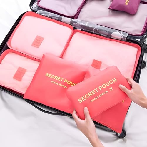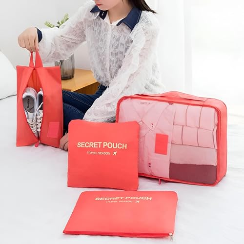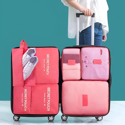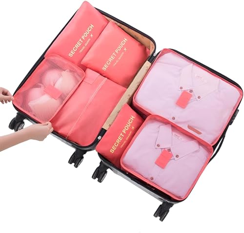 Generic - Polyester Set - Seven piece travel cubes with wash and vanity bags in watermelon red, water resistant fabric ideal for organizing household items