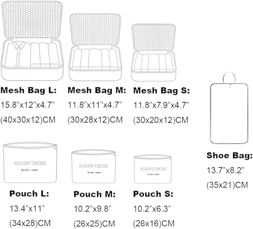 - The inclusion of a dedicated shoe bag measuring thirteen point seven by eight point two inches provides a hygienic solution for transporting footwear, ensuring that soles and dirt never come into contact with clean clothing or delicate fabrics. This separate compartment is equally useful for isolating dirty laundry after use, allowing travelers to keep soiled garments apart from fresh ones until they can be washed upon returning home. The mesh design on the packing cubes enhances breathability,
