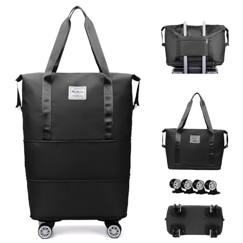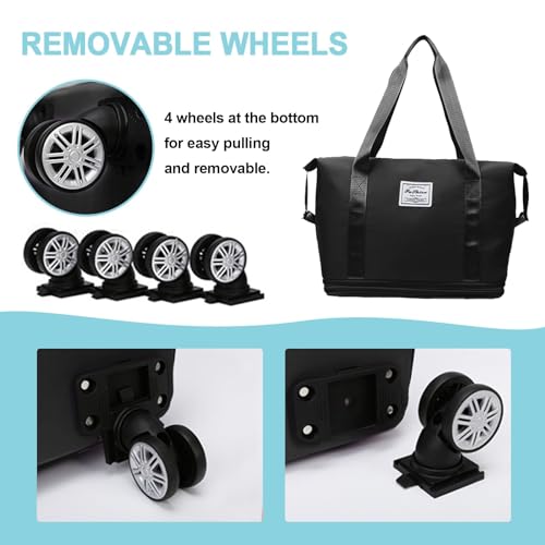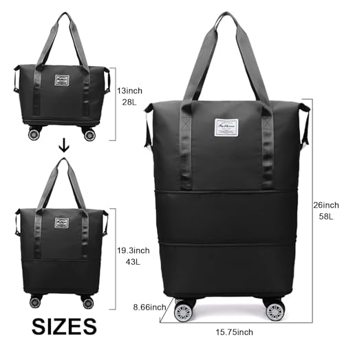 Pretocter - Foldable Travel Duffle Bag for Men Women Portable Suitcase Bag with Removable Wheels Large Storage Luggage Organizers Waterproof Carry-on Overnight Camping Rolling Duffel Bag-Black